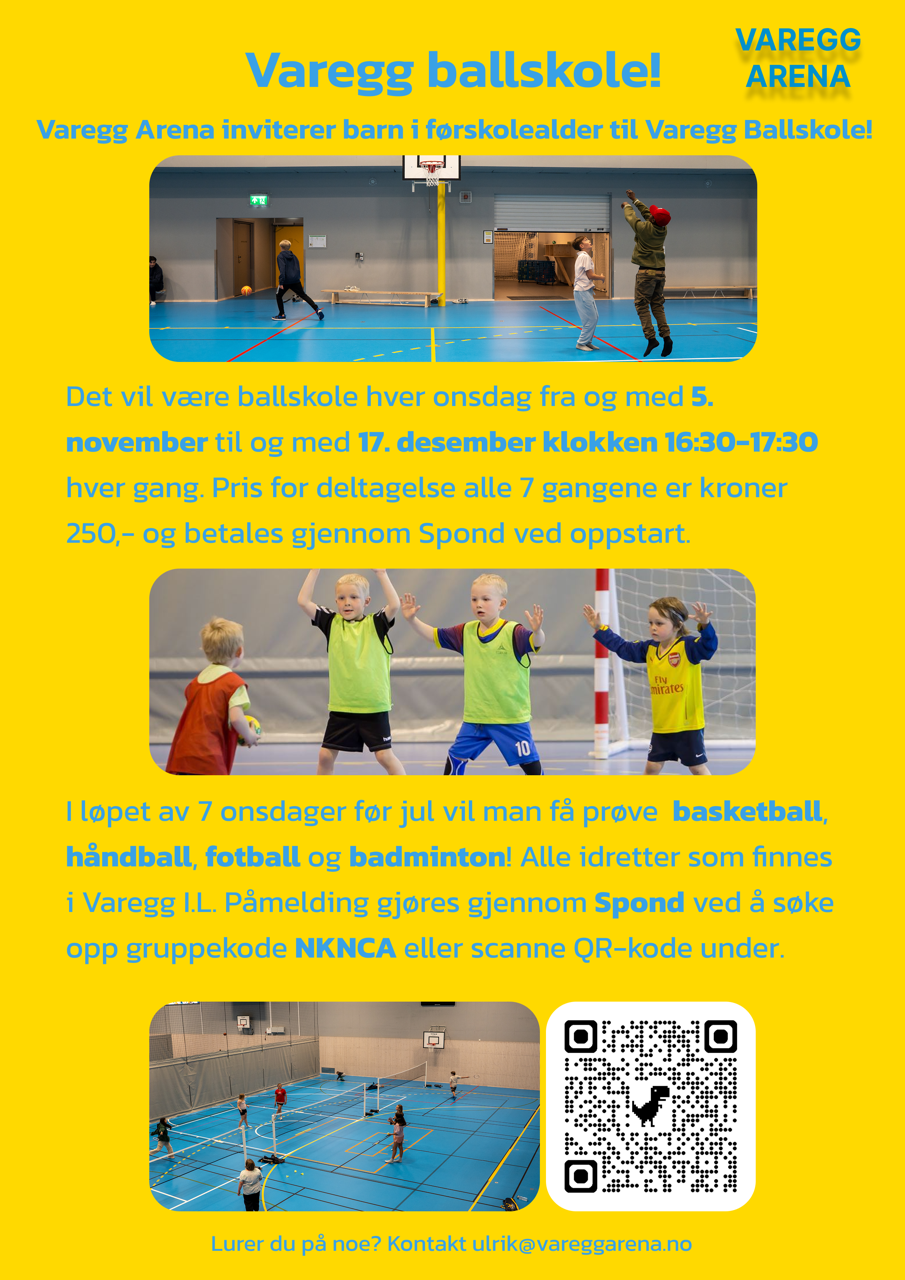 Ballskolen er et tiltak for alle barn i førskolen (siste år i barnehagen) for å introdusere barn og unge for flere idretter tidlig. Dette vil gi barna mulighet for å prøve ulike ballspill som forhåpentligvis gjør at de kan finne aktivitetsglede i flere ulike idretter på sikt! Varegg Arena Ballskole vil bli gjennomført i Varegg Arena hver onsdag fra og med onsdag 5. november til og med onsdag 17. desember klokken 16:30-17:30 hver gang. I løpet av 7 onsdager før jul vil barna få prøve håndball, badminton, basketball og fotball - alle idretter man kan drive med i organisert trening i Varegg I.L (håndball gjennom TIF Viking som trener i Varegg Arena).