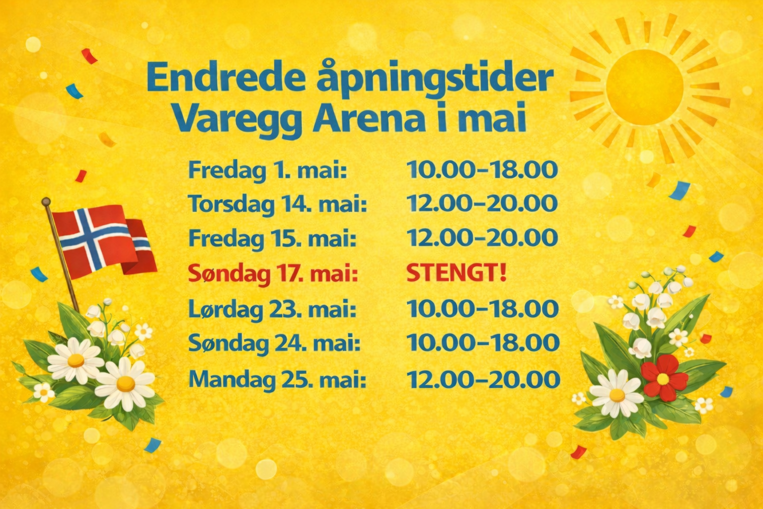 Våren er kommet og det nærmer seg mai med dertil røde dager. Varegg Arena vil ha noe endrede åpningstider i den forbindelse. Disse finner du i oversikten under. Resten av dagene i mai har odrinære åpningstider som du finner ved å klikke her.
