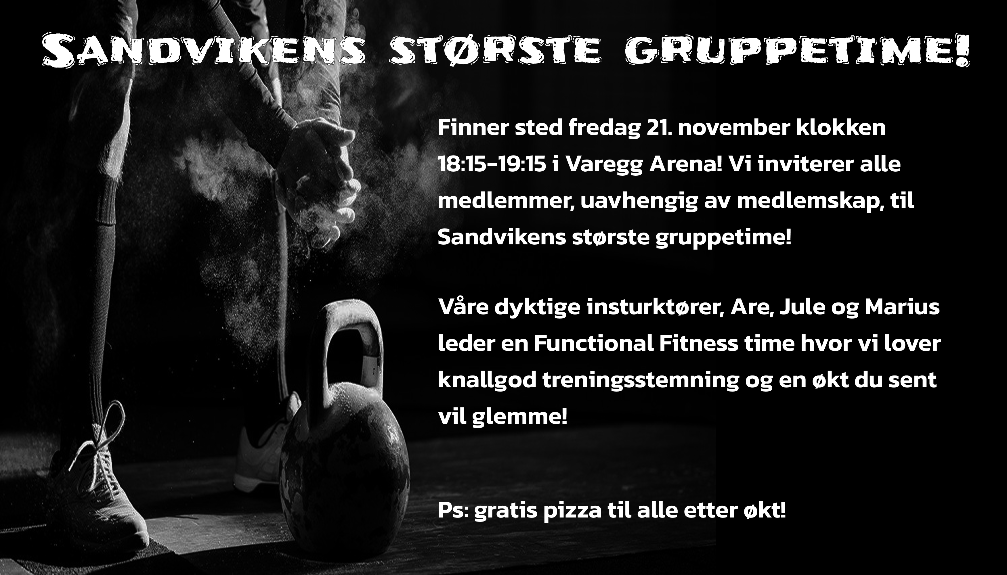 Fredag 21. november klokken 18:15-19:15 inviterer vi alle medlemmer, uavhengig av medlemskap, til Sandvikens største gruppetime! Vi rigger om idretthallen til en Functional Fitness-arena, senker lyset og skrur opp volumet! Sammen skaper vi en treningsatmosfære og treningsøkt du sent vil glemme! Denne økten vil bli ledet av våre flinke instruktører Julie, Are og Marius og passer både for deg som har vært på Functional Fitness-timer tidligere, eller er fersk i treningsformen. Vi garanterer uansett en unik økt og en fredag du sent vil glemme! Etter økten samles vi i kafé Mon Plaisir for pizza som Fjellsiden Treningssenter spanderer.