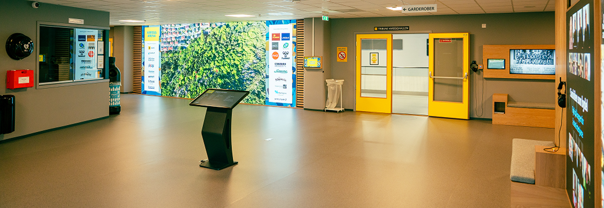 Skjerm som veksler mellom dagens program og hvor det foregår i anlegget og info om anlegget generelt og Varegg + hva man finner i «Visningen». Interaktive muligheter for å søke seg til «sitt» arrangement eller trenings/kurssted osv.