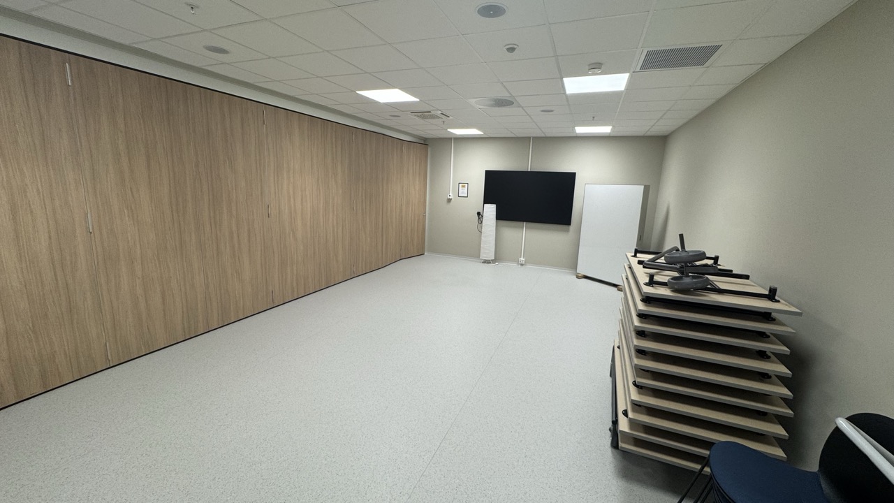 Vi har skjerm med HDMI, vi har lyd og vi har en whiteboard