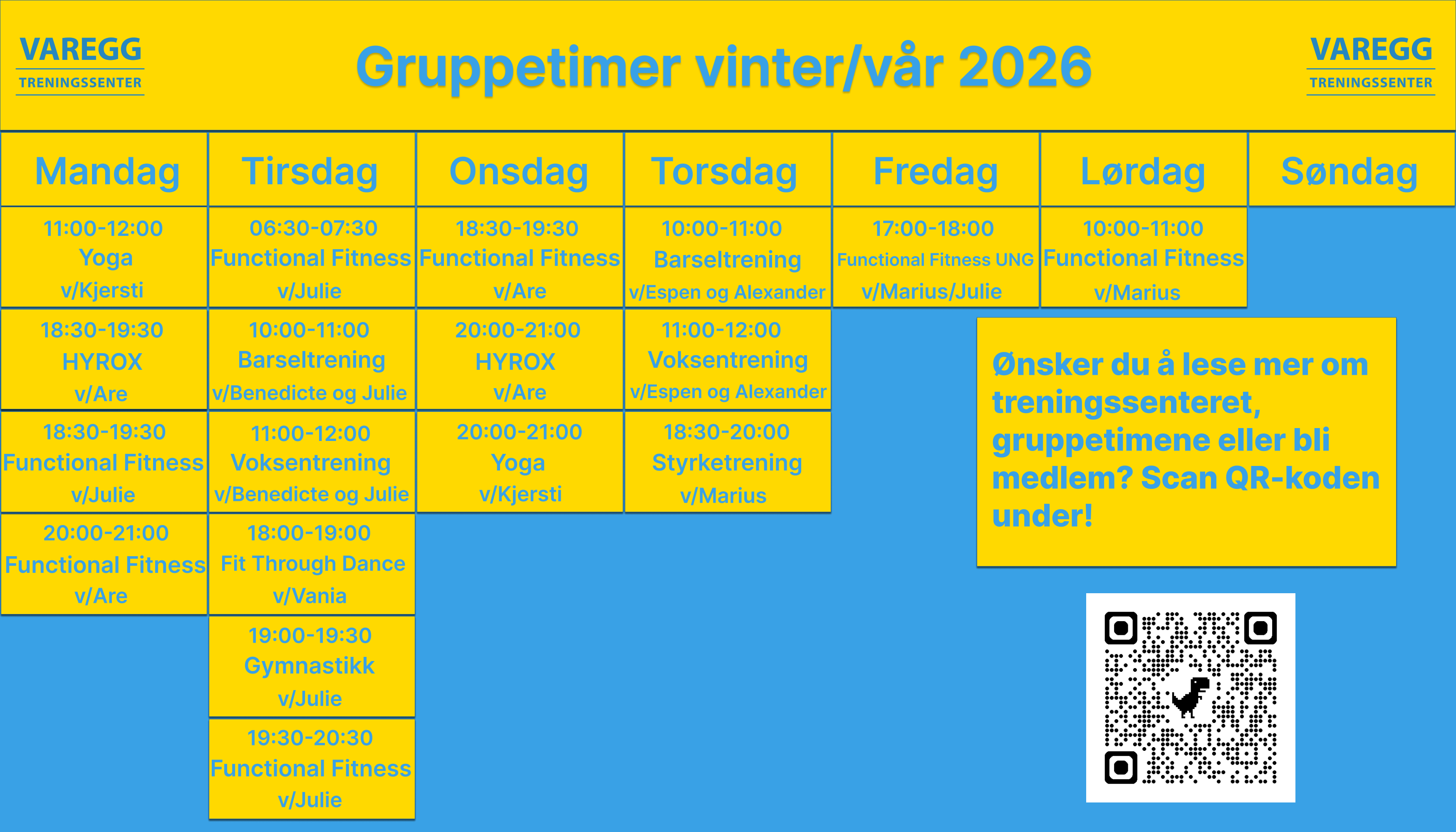 Kontakt kundeservice: varegg.treningssenter@vareggarena.no.